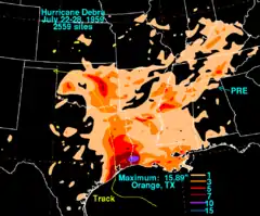 The highest reported winds were estimated at 80–90 mph (130–150 km/h), with gusts up to 105 mph (165 km/h) at the Brazos River floodgates near Freeport.[13] Tides were 3 feet (0.91 m) to 5 feet (1.5 m) at Galveston Bay; Morgan Point measured the highest tides, at 7.9 feet (2.4 m) above normal.[1] Overall, the storm surge was about 7 feet (2.1 m) high; near Harrisburg, Houston, its height was approximately 9.6 feet (2.9 m); around the Kemah-Seabrook area, the storm surge was 7 feet (2.1 m), while along the Dickinson Bayou they were 7 feet (2.1 m) to 9 feet (2.7 m) above average.[5][14] Alongside the Gulf Coast, especially in Texas, there were widespread measurements of heavy rainfall, which included a total of 15.89 inches (404 mm) at Orange, Texas, which led to the inundation low-lying streets; this total was the highest attributed to Debra.[9][15] A daily rainfall record of 3.62 inches (92 mm) was achieved at Beaumont, and hurricane-force winds stretched 100 miles (160 km) inland.[16]
