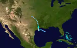 As the result of a polar trough aloft in the central United States, Debra curved northward though its winds shifted southward, defying the earlier prediction of a bend west-northwest to northwest. A reconnaissance flight determined the location of its center during the mid-morning,[1] and the hurricane made landfall near its peak intensity between Freeport and Galveston, Texas during the evening of July 24 local time (0000 UTC on July 25). It rapidly weakened on July 26 while it arched west-northwest, though it maintained tropical characteristics until its dissipation on July 28 over central Oklahoma while the system progressed north-northwestward.[1][2] As it moved inland, moisture along its eastern fringe converged with a front to its northeast, causing heavy rains that were confined to limited areas in northeast Louisiana and southern Arkansas; they eventually traversed east-northeastward over northern Mississippi, Tennessee, and Kentucky.[3] Moisture and instability from Debra led to high-level thunderstorms in Montana and northern Idaho on July 31 and August 1.[4]