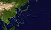 The combination of reconnaissance data and satellite imagery supported an upgrade of the storm back to Category 3 intensity at 06:00 UTC on August 16.[15][10] At the time, Dora was passing about 200 mi (320 km) south of Hawaii – the storm's closest approach to the state.[2] The secondary peak intensity was brief, as weakening occurred shortly thereafter. Dora passed about 65 mi (105 km) south of Johnston Atoll on August 18 as a Category 1 hurricane before turning west-northwestward. Around 00:00 UTC on the following day, Dora weakened to a tropical storm as it crossed the International Date Line. As a result, the storm became the first tropical cyclone since John in 1994 to have existed in all three north Pacific basins. The Joint Typhoon Warning Center tracked the remainder of the duration of Dora. The storm encountered stronger wind shear,[10] and by August 21, winds decreased below tropical storm force.[2] On August 23, the circulation became exposed from the main convection,[10] and at 18:00 UTC, Tropical Depression Dora dissipated about 450 mi (725 km) northeast of Wake Island.[2]