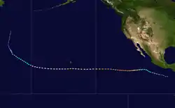 With a total track of about 6,500 mi (10,500 km), Hurricane Dora had the second longest track of a Pacific hurricane, behind only Hurricane John of 1994; the length of the track of Dora was more than four times the basin average.[23] Dora was also the first Pacific hurricane to come close enough to be detected by radar.[24] In addition, the hurricane was the first tropical cyclone to move across all three Pacific basins since John in 1994.[2]