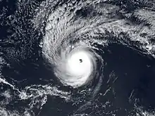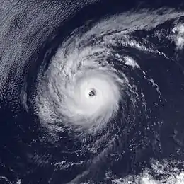 Later on August 11, the NHC predicted relatively slow weakening beginning in about 24 hours, as the storm would cross over slightly colder sea surface temperatures in the wake of Hurricane Eugene.[8] However, at 00:00 UTC on August 12, Dora attained its peak intensity with maximum sustained winds of 140 mph (220 km/h) and a minimum barometric pressure of 943 mbar (27.8 inHg).[2] At the time of peak intensity, the hurricane featured a 17 mi (27 km) diameter eye, surrounded by cloud tops with temperatures of −85 to −94 °F (−65 to −70 °C).[9] Six hours later, Dora weakened slightly due to an eyewall replacement cycle, but re-attained peak intensity by 12:00 UTC.[2] The cyclone again fell below peak intensity at 12:00 UTC on August 13 due to cooler waters and increasing wind shear.[2][10] Dora weakened to a Category 3 about six hours later,[2] as the eye became cloud-filled and surrounding cloud tops warmed.[11]