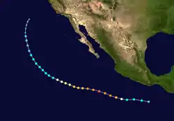Afterward, the hurricane began to weaken in an irregular fashion. After the inner eyewall dissolved, the intensity of the hurricane decreased to a low-level Category 3 storm, with winds of 120 mph (190 km/h).[10] By this time, Elida had reached the edge of the ridge that kept the cyclone from turning northwest, and a turn to the northwest was beginning. The hurricane proceeded to undergo another eyewall replacement cycle, lowering its intensity to Category 2 intensity.[11] Late on July 26, the eye disappeared from satellite.[12] The weakening trend continued, and Elida weakened to a tropical storm on July 27.[1] At this time, a weakness in the subtropical ridge allowed the storm to make a turn towards the north.[13] Early on July 28, Elida began redeveloping, regaining moderate convection and possibly reintensifying,[14] but eventually, the storm weakened back into a depression early on July 29.[15] On the next day, Elida degenerated into a remnant low, and the last advisory was issued while an area of convection was displaced to the north of the center, with 12-foot (3.7 m) seas in the area.[16] The center was 805 mi (1,296 km) from Punta Eugenia, Mexico when the last advisory was issued.[17] The remnant low of Elida moved northeast and eventually dissipated on July 31, 535 mi (861 km) west of Los Angeles, California.[1]