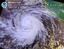 The storm continued to rapidly intensify and gradually developed a banding eye feature and infrared satellite images showed a possible eyewall in the central dense overcast.[4] After six more hours, a small eye had formed and Elida was upgraded to a high-end Category 2 hurricane on the Saffir-Simpson Hurricane Scale with 110 mph (180 km/h) winds on July 24, only eighteen hours after having first been initiated as a 35 mph (56 km/h) tropical depression.[5] Elida continued to rapidly strengthen, breaking the Dvorak estimates and reaching 135 mph (217 km/h) six hours afterward, making it a Category 4 hurricane and resulting in a rare forecast for the hurricane to reach Category 5 intensity.[6] The hurricane, moving at 16 mph (26 km/h), proceeded to make a west-northwestward turn while displaying an eye with an estimated diameter of 11 mi (18 km).[7] On July 25, Elida reached the highest sustained wind speed of a Category 4 hurricane, at 155 mph (249 km/h), though the possibility that Elida was briefly a Category 5 hurricane just prior to the advisory issuance was indicated.[8] Even though a later discussion mentioned that Elida had attained Category 5 status,[9] it was not until the Tropical Cyclone Report that it was finally analyzed that Elida had maintained Category 5 strength for only six hours.[1] At this time, Elida was observed to have formed concentric eyewalls, but it was not until the hurricane moved over cooler waters that the storm's eyewall replacement cycle was completed.[1]