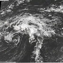 By August 9, increasing wind shear further weakened the storm, with Felicia being downgraded to a tropical storm early that day.[23] The storm rapidly weakened throughout the day as convection gradually dissipated around the center due to the shear. By the late morning hours, little convective activity remained around the low pressure center of Felicia.[24] A weak cyclone, the storm continued to track towards Hawaii with the only deep convection associated with it being displaced to the northeast of the center.[25] The system slowly weakened before being downgraded to a tropical depression on August 11 as no areas of tropical storm-force winds were found by Hurricane Hunters.[26] Several hours after being downgraded, the CPHC issued its final advisory on Felicia as it degenerated into a remnant low near the Hawaiian Islands.[27] The system dissipated shortly thereafter.[3]
