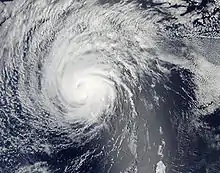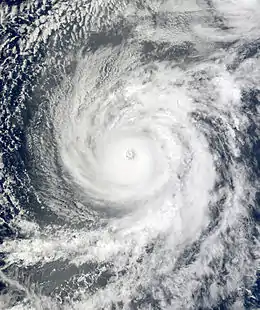 Late on August 4, the intensity of Felicia led to it taking a more northward turn in response to a mid- to upper-level trough off the coast of the Western United States.[12] Early the next morning, the storm continued to intensify and attained Category 3 status with winds of 115 mph (185 km/h).[13] Maintaining a well-defined eye, Felicia neared Category 4 status[14] and hours later, the storm attained winds of 140 mph (220 km/h) and a pressure of 937 mbar (hPa; 27.67 inHg) during the evening hours, making it the strongest Pacific storm east of the International Date Line since Hurricane Ioke in 2006[1][15] and the strongest in the eastern Pacific basin since Hurricane Daniel of 2006.[1][2] Around 5:00 pm PDT (0000 UTC August 6) Felicia reached its peak intensity with winds of 145 mph (230 km/h) and a minimum central pressure of 935 mbar (hPa; 27.61 inHg).[2][3]