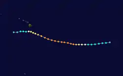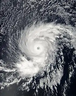Located on the southwestern periphery of a subtropical ridge situated over southwestern Mexico, Flossie tracked generally west-southwestward after formation while intensifying.[2] Upper-level outflow began to expand in all quadrants of the cyclone and spiral bands became prominent around the center on August 9.[3] An eyewall and associated mid-level eye-feature was observed on microwave imagery, but was obscured on conventional satellite imagery, that evening.[4] Following a series of satellite intensity estimates and the presence of an eye on visible and infrared satellite imagery, Flossie was upgraded to a Category 1 on the Saffir–Simpson hurricane wind scale at 1200 UTC on August 10.[1] Despite forecasts of an increasingly unfavorable environment as the cyclone moved towards the Hawaiian Islands, Flossie continued to intensify. The hurricane unexpectedly began a period of rapid deepening during the overnight hours of August 10, and by 0600 UTC on August 11, Flossie attained major hurricane intensity – a Category 3 hurricane – with a quickly falling barometric pressure. Early morning satellite images revealed a 15 nmi (28 km) eye with cloud tops cooler than −75 °C (−103 °F) surrounding the feature.[5][6] Further intensification ensued as the storm entered the Central Pacific Hurricane Center (CPHC)'s area of responsibility that morning, and Flossie was upgraded to a Category 4 hurricane by 1200 UTC. Two hours later, the cyclone attained its peak intensity with maximum sustained winds of 140 mph (220 km/h) and a minimum barometric pressure of 949 mb (hPa; 28.02 inHg), the strongest tropical cyclone of the 2007 Pacific hurricane season.[1]