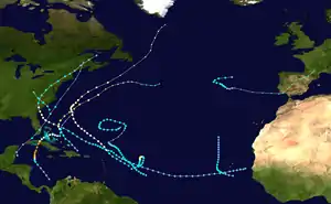 Early on October 25, Hurricane Fox entered the Atlantic Ocean.[3] It crossed central Andros and turned east across the Bahamas.[3] On October 26, the hurricane briefly re-intensified[3] as it crossed Cat Island.[6] The center became ill-defined,[6] and the cyclone quickly weakened.[3] It turned north and then took an erratic northeast turn as it weakened to a tropical storm on October 27.[3] The system gained extratropical characteristics as it merged with a polar frontal boundary,[2] and it dissipated west-southwest of Bermuda on October 28.[3]