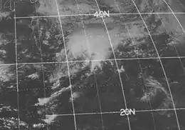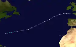 Steered generally eastward by a deep surface low in the westerlies, Fran accelerated towards the Azores Islands.[2] The storm traveled at a rapid pace of 30 to 35 mph (48 to 56 km/h) but continued to organize.[7] By October 11, the hurricane began to undergo an extratropical transition as it continued to move unusually fast towards the northeast.[8] Around this time, Fran attained its peak winds of 80 mph (130 km/h).[4] Shortly after bypassing the Azores islands on October 12, the system moved over an area with sea surface temperatures around 60 °F (16 °C), well below what is required for tropical cyclone development.[9] Later that day, the central pressure of Fran decreased to 978 mbar (hPa; 28.88 inHg), the lowest recorded in relation to the hurricane. Shortly after reaching this intensity, the hurricane transitioned into an extratropical cyclone and quickly merged with a cold front off the coast of France.[2]