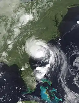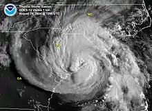 At 1400 UTC on August 29, Gaston made landfall at Awendaw, South Carolina, between Charleston and McClellanville, as a Category 1 hurricane with maximum sustained winds of 75 mph (121 km/h).[1] The storm quickly weakened to a tropical storm as it continued northward through South Carolina, North Carolina and Virginia, and it began to gradually move north-northeastward.[4] At 0000 UTC on August 30, the storm weakened to a tropical depression over northeastern South Carolina. As it accelerated to the northeast, it emerged in the open waters of the Chesapeake Bay and regained tropical storm status late on August 30.[5] Initially, the system maintained a good radar signature, although satellite imagery soon indicated that convection became limited in intensity and coverage. Also, a front-like band appeared to be forming southeast of the center, which indicated signs of weakening.[6] At 0600 UTC on August 31, Gaston crossed the Delmarva Peninsula for the waters of the Atlantic Ocean.[1] The system began to lose tropical characteristics as it became associated with the frontal system, although there was still some thunderstorm activity wrapped around the center.[7] Forward speed increased to about 30 mph (48 km/h),[1] and over 60 °F (16 °C) water[8] the storm lost all of its tropical characteristics early on September 1, and became an extratropical cyclone south of the Canadian Maritimes.[1] The extratropical remnants of Gaston were absorbed by a larger extratropical system on September 3, about 750 mi (1,210 km) south-southeast of Reykjavík, Iceland.[1]