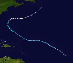 Hurricane Irene was a long-lived Cape Verde hurricane during the 2005 Atlantic hurricane season. The storm formed near Cape Verde on August 4 and crossed the Atlantic, turning northward around Bermuda before being absorbed by an extratropical cyclone while situated southeast of Newfoundland. Irene proved to be a difficult storm to forecast due to oscillations in strength. After almost dissipating on August 10, Irene peaked as a Category 2 hurricane on August 16. Irene persisted for 14 days as a tropical system, the longest duration of any storm of the 2005 season. It was the ninth named storm and fourth hurricane of the record-breaking season.
