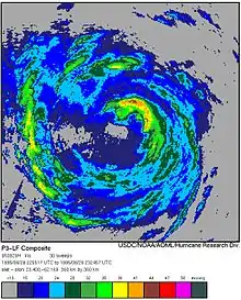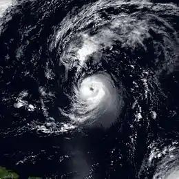 On August 28, Iris moved away from the Lesser Antilles, and at 1800 UTC re-attained hurricane status as it began a steady motion to the north-northwest.[1] By that time, there was uncertainty in its future track due to the possible interactions among Iris, Humberto to the northeast, Tropical Storm Karen to the southeast, and the remnants of Tropical Storm Jerry to the west.[9] In addition, after Tropical Storm Luis formed on August 27, there were four active tropical cyclones in the Atlantic.[10] A few days later, there were three simultaneous hurricanes, which is a rare event, when Luis attained hurricane status.[11] On August 30, Iris turned to the northeast while it began interacting directly with Tropical Storm Karen. Over the next few days, the smaller tropical storm moved around the larger circulation of Iris, potentially causing the hurricane to move erratically.[1] Iris' intensity did not change significantly during that time, and it maintained strong outflow but a weak eyewall. An eastward-moving trough bypassed the storm to the north, causing the motion to become nearly stationary.[12] A building ridge to the northeast caused Iris to turn to a northwest drift on September 1. By that time, the eye had become distinct and well-organized,[13] and at 0600 UTC that day, Iris attained peak winds of 110 mph (175 km/h) to the southeast of Bermuda.[1]