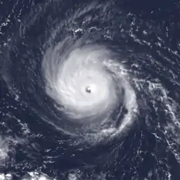 After reaching winds of 120 mph (205 km/h), Isaac slowly began weakening, due to both increasing vertical wind shear and internal fluctuations.[2] By September 26, Isaac weakened to a moderate Category 1 hurricane, though the National Hurricane Center noted that re-strengthening was likely, citing the possibility of warming SST's.[8] Wind shear began to decrease, which caused deep convection to re-organize into a more symmetrical pattern around the center of the storm. As a result, Isaac began re-intensifying, starting on September 27.[9] Although Isaac re-developed a well-defined eye and a cold convective eyewall, only a portion of the storm had decent outflow.[10] By 1800 UTC on September 28, Isaac attained its peak intensity with winds of 140 mph (220 km/h) and a minimum barometric pressure of 943 mbar (27.8 inHg).[2] Three hours later, the National Hurricane Center noted that the storm had likely reached peak intensity, though further strengthening could not be ruled out.[11] After tracking steadily west-northwestward or northwestward since it developed on September 21, the storm briefly curved northward western periphery of a mid-tropospheric anticyclone later on September 28. While a Category 3 hurricane on September 29, Isaac passed about 500 miles (800 km) east of Bermuda.[2] Further weakening occurred as Isaac tracked into decreasing SST's, while undergoing an eyewall replacement cycle.[12] Late on September 29, the storm began curving east-northeastward and weakened to a Category 2 hurricane.[13]
