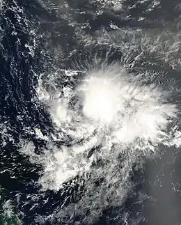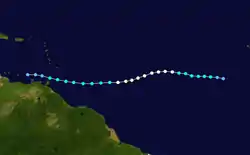 Wind shear then increased, partially exposing Joyce's center of circulation,[7] although bursts of convection remained.[1] Convection and organization slowly deteriorated,[1] and became, early on September 29, "pretty crummy"[8] and without a well-defined center of circulation. Joyce did manage to remain at hurricane intensity through this time.[8] Due to the disorganization, it was downgraded to a tropical storm later that day.[9] Despite occasional bursts of convection,[10] Joyce weakened into a tropical depression as it crossed the Windward Islands on October 1. The weakening was confirmed by Hurricane Hunter reconnaissance flights. After crossing the Windward Islands, and entering the southeastern Caribbean Sea, Joyce unexpectedly degenerated into an open wave.[1] Although Joyce's remnants were monitored for regeneration,[11] any possible redevelopment never materialized.[12]