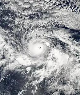 Initially, the depression was forecast to reach maximum strength as a tropical storm before weakening, and only the Geophysical Fluid Dynamics Laboratory's hurricane model predicted it to attain hurricane status. However, low amounts of wind shear and warm sea surface temperatures favored further intensification.[4] After being previously removed from the primary thunderstorm activity, the circulation became situated beneath a persistent area of deep convection.[5] It is estimated the cyclone intensified into Tropical Storm Kenneth early on September 15.[1] The storm quickly developed banding features—spiral rain showers of convection—as its convection formed into a central area of deep convection.[6] These were all signs for further development,[7] and Kenneth attained hurricane status early on September 16.[1] By September 17, the hurricane had finished an eyewall replacement cycle, meaning its original eye was replaced by a larger, better defined eye.[8] As a result, it quickly intensified and attained major hurricane status.[1] With a 23-mile (37 km) wide eye surrounded by very cold cloud tops,[9] Kenneth strengthened to reach peak sustained winds of 135 mph (215 km/h), a Category 4 hurricane on the Saffir-Simpson scale, on September 18 about 1725 miles (2790 km) east of the Big Island of Hawaii.[1]