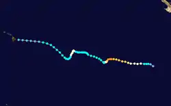 Hurricane Kenneth maintained minimal hurricane status for about 30 hours as it drifted southwestward, during which it entered the area of responsibility of the Central Pacific Hurricane Center.[1] Increasing shear weakened Kenneth to tropical storm status on September 26, and it began a steady northwest track under the influence of low- to mid-level steering flow.[16] By September 27, most of its convection had dissipated, excluding a small area of thunderstorms to the southeast of the center.[17] Convection intermittently reformed near the center, though the combination of wind shear and cooler water temperatures prevented restrengthening.[18] On September 29, an intensifying upper-level trough over the Hawaiian Islands weakened Kenneth to tropical depression status.[16] Thunderstorms failed to reform, and on September 30 it degenerated into a tropical wave about 40 miles (65 km) east of the Big Island of Hawaii. A remnant swirl of clouds later moved onshore of the Big Island.[16]