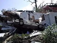 Moderate rainfall from Kyle in South Carolina peaked at 6.35 inches (161 mm) in Edisto Beach, with the precipitation resulting in minor urban flooding.[1] In and around St. Stephen, flooding reached several feet in depth in roads and buildings; there, a nursing home had to be evacuated because of flooding.[36] High waters in Manning severely damaged 17 mobile homes, forcing about 50 people to move to shelters.[37] Ten car accidents were reported in Florence.[38] The tropical storm spawned an F2 tornado in Georgetown that remained on the ground for about 1.25 miles (2 km). At its peak strength, the tornado overturned five mobile homes and a car.[39] The tornado destroyed seven homes and damaged 106 buildings, 28 severely. Eight people were injured by the tornado.[40]