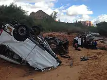 Alongside the fatalities, the floods left several blocks of the town without power.[27] Water lines, bridges, and other infrastructure sustained varying degrees of damage. Several homes sustained water and mud damage. Total losses in Washington County reached $750,000.[28] Flooding continued downstream into Arizona, rendering multiple roads impassible and damaging bridges around Colorado City; losses in the city amounted to $500,000.[29] Around 150 federal personnel and 500 community volunteers, including 70–80 percent of Hildale's residents, conducted search and rescue in the immediate aftermath.[22][30] Twenty-four members of Utah Task Force One and twenty-six personnel from the Utah National Guard were dispatched to Hildale to assist in search and rescue along Short Creek. Dangerous conditions along the creek slowed the operation.[31] By September 17, 300 personnel were searching for a 6-year-old boy who was still missing.[32] Ultimately, thousands of people from more than 60 agencies took part in the search for the final victim; efforts were called off by September 29 and the missing boy was presumed dead.[21] Local residents continued periodic searches for the boy through December.[30] The Utah Department of Public Safety granted the Public Safety Award to Washington County Sheriff Cory Pulsipher, Hildale Mayor Philip Barlow and, Hildale Marshall's Office Chief Jeremiah Darger for their response coordination.[33] Following the floods, the Washington County allocated $1.6 million through the Natural Resources Conservation Service for repair costs and mitigation efforts for future floods. Of this total, $1.5 million went to Hildale.[25] The United States Department of Agriculture also provided $100,000 through the Emergency Watershed Protection program.[34]