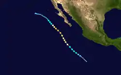 A tropical wave emerged into the Atlantic Ocean from the west coast of Africa on August 21. By four days later, the system spawned Tropical Storm Erika over the eastern Atlantic. The southern portion of the wave persisted westward and moved over Central America on August 30. Shower and thunderstorm activity associated with the wave began to increase over the next few days as it crossed the Gulf of Tehuantepec. Convection was enhanced further on September 2 as a Kelvin wave interacted with the tropical wave, eventually resulting in the development of a broad low pressure area.[1] Early the following day, the National Hurricane Center (NHC) issued a Tropical Weather Outlook (TWO) for a cluster of clouds that showed signs of organizing into a tropical system. Wind shear was forecast to become more conducive for tropical cyclogenesis over the next few days.[2] Although the shear remained moderately strong, the low acquired a well-defined center of circulation by September 4. Following further organization of deep convection, Tropical Depression Fifteen-E developed at 18:00 UTC on September 5 while located about 490 mi (790 km) southwest of Manzanillo, Colima.[1]