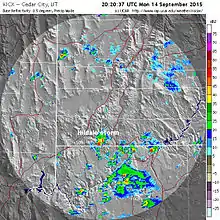 During the afternoon of September 14, two successive thunderstorms produced more than 2 in (51 mm) of rain—a 1-in-100 year event[23]—near Hildale, Utah in Washington County.[13] The National Weather Service issued a strongly worded flash flood warning at 20:22 UTC (2:22 p.m. MDT) for the area,[13] stating "Move to higher ground now. Act quickly to protect your life".[23] The first storm resulted in a 3.42 ft (1.04 m) rise along the Short Creek, as measured by a stream gauge in Colorado City, Arizona, in 19 minutes around 21:18 UTC (3:18 p.m. MDT),[22][23] with residents gathering nearby to observe.[23] Between 22:48 and 23:05 UTC (4:48 and 5:05 p.m. MDT), a second surge of water swept down the creek with the Colorado City gauge reporting a rise of 5.36 ft (1.63 m);[22] the gauge stopped reporting at 23:47 UTC (5:47 p.m. MDT). The second flood swept away two vehicles carrying a collective 16 people while they were observing the rising waters.[23] Thirteen people were killed and three children were rescued.[24] Six bodies were recovered in Utah and two in Arizona, 2.5 mi (4.0 km) downstream.[22] Other bodies were found up to 7 mi (11 km) downstream.[25]