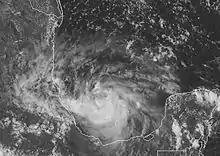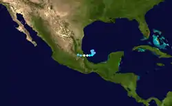 Hurricane Lorenzo quickly developed a closed eyewall, which was observed on radar and provided a peak intensity estimate of 80 mph (130 km/h) at 0000 UTC on September 28. The cyclone maintained vigorous and symmetric convection across the center, although the structure deteriorated slightly before Lorenzo crossed the coast near Tecolutla, Veracruz at 0500 UTC that day, with winds estimated around 75 mph (120 km/h).[1][6] After making landfall, the hurricane rapidly weakened to tropical depression intensity.[1] Progressing inland, the circulation became difficult to locate as the convection diminished to rainbands along the coast.[7] Within 19 hours after moving ashore, the circulation of Lorenzo dissipated, therefore ending its duration as a tropical cyclone.[1]