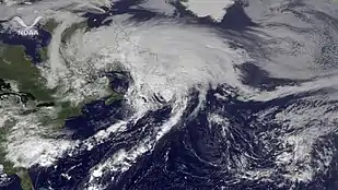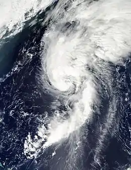 After reaching the southwestern periphery of the subtropical ridge, Maria turned to the north as its forward motion slowed considerably. Strong vertical wind shear over the system began to relax by September 14, allowing Maria to slowly restrengthen as the convection redeveloped near its center.[6] At 1800 UTC on September 15, Maria reached Category 1 hurricane status on the Saffir–Simpson Hurricane Scale while located roughly 135 mi (215 km) northwest of Bermuda.[1] Embedded within increasing atmospheric flow, the hurricane's forward motion accelerated towards the northeast. At 0000 UTC on September 16, Maria attained its peak intensity with winds of 80 mph (130 km/h) and a minimum barometric pressure of 983 mbar (29.03 inHg). Continuing on a northeastward course, Maria began to move over an area with cooler sea surface temperatures and higher vertical wind shear. Around 1800 UTC, Maria weakened to a tropical storm and made landfall near Cape St. Mary's, Newfoundland at 1830 UTC with winds of 70 mph (110 km/h). Shortly thereafter, the cyclone's circulation was absorbed by a frontal system over the Avalon Peninsula of Newfoundland, on September 18.[1]