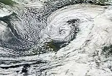 The center of Noel remained well-organized as it tracked through eastern Cuba, though its sustained winds quickly diminished to minimal tropical storm force.[14] Early on October 31, Noel began drifting to the north-northwest, in response to the approach of a short-wave trough from the west and the eastward shift of the mid-level ridge.[15] A large area of strong convective rainbands persisted to its east, though due to increased upper-level wind shear, there was little convection near the center.[16] Shortly after 1200 UTC, on October 31, Noel emerged off the north coast of Cuba,[17] and subsequently, the cyclone became better organized as storm's the circulation became better associated with the convection.[18] While located just off the north coast of Cuba, the motion of Noel was nearly stationary, though forecasters indicated it could have executed a small cyclonic loop.[19] On October 31, the Canadian Hurricane Centre began tracking the storm.[20]