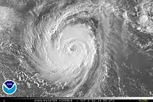 On October 7, Hurricane Norbert reached Category 2 intensity on the Saffir-Simpson Hurricane Scale while Norbert developed well-defined and closed eyewall as seen in microwave imagery.[8] Overnight on October 8, an eye appeared on infrared satellite, indicating that Norbert was intensifying and the storm was upgraded to a major hurricane respectively.[9] Continuing to rapidly strengthen over warm sea surface temperatures, it reached Category 4 status late on October 8, after intensifying 45 mph (75 km/h) over the previous 24 hours. The storm peak intensity was 135 mph (215 km/h) and a peak pressure of 945 mbar (hPa; 27.91 inHg) while located 350 mi (560 km) south of Cabo San Lucas, Mexico. The peak intensity of Norbert is uncertain as aircraft-based wind speed observations were lower than estimates via Dvorak Technique.[1] However, the cloud pattern became less impressive early on October 9, and was thus downgraded into a Category 3 hurricane, with winds of 125 mph (205 km/h) as it moved.[10] The eye began to erode and as such Norbert underwent an eyewall replacement cycle, where one eye is replaced by another. As a result, when Hurricane Hunters investigated the storm later that day, they found that Norbert had weakened considerably. At that time, it was downgraded into a weak Category 1 hurricane on October 9.[1]