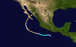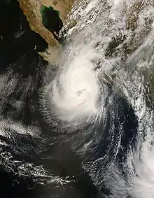 Hurricane Norbert is tied with Hurricane Jimena as the strongest tropical cyclone to strike the west coast of Baja California Sur in recorded history. The fifteenth named storm, seventh hurricane, and second major hurricane of the 2008 hurricane season, Norbert originated as a tropical depression from a tropical wave south of Acapulco on October 3. Strong wind shear initially prevented much development, but the cyclone encountered a more favorable environment as it moved westward. On October 5, the National Hurricane Center (NHC) upgraded the depression to Tropical Storm Norbert, and the system intensified further to attain hurricane intensity by October 6. After undergoing a period of rapid deepening, Norbert reached its peak intensity as a Category 4 on the Saffir–Simpson hurricane wind scale, with maximum sustained winds of 135 mph (215 km/h) and a minimum barometric pressure of 945 mbar (hPa; 27.91 inHg). As the cyclone rounded the western periphery of a subtropical ridge over Mexico, it began an eyewall replacement cycle which led to steady weakening. Completing this cycle and briefly reintensifying into a major hurricane, a Category 3 or higher on the Saffir–Simpson hurricane wind scale, Norbert moved ashore Baja California Sur as a Category 2 hurricane late on October 11. After a second landfall at a weaker intensity the following day, the system quickly weakened over land and dissipated that afternoon.
