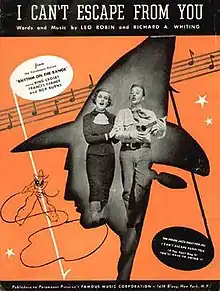 "I Can't Escape from You" is a song written music by Richard A. Whiting and lyrics by Leo Robin for the 1936 Paramount Film "Rhythm on the Range", and first introduced in the film when Bing Crosby sang it to Frances Farmer. Crosby recorded it for Decca Records that same year with the Jimmy Dorsey Orchestra[1] and it was in the hit parade for 11 weeks reaching a peak position of No. 7.[2] Crosby recorded the song again in 1954 for his album Bing: A Musical Autobiography.