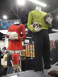 Further sets for the Defiant were created for the second part of the episode, which included designs previously used in "Trials and Tribble-ations" for the Jefferies tube. The other sets included the Rec Room, Captain's quarters and the briefing room. Classic Original Series style uniforms were worn by some the main cast in the second installment; however, the production crew mistakenly gave the USS Defiant a unique uniform insignia different from the iconic delta (arrowhead) badge. This mistake likely stemmed from the erroneous fan theory that every starship in TOS had its own unique insignia. In the TOS episode "The Tholian Web" we clearly see the dead crew of the Defiant wearing the delta badge.[19] Bakula wore the wrap-around green uniform previously worn by Shatner in several episodes including "The Trouble with Tribbles", while Trinneer, Keating and Montgomery donned red shirts. Bakula joked "Did we run out of material for Jolene's skirt?" as Blalock wore the science-blue miniskirt in the style of that worn by Christine Chapel. The normal Enterprise costumes also underwent changes, with those worn by female members of the crew having a portion removed to reveal their midriffs.[7]
