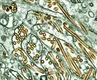 Influenza A virus subtype H5N1 (A/H5N1) is a subtype of the influenza A virus which can cause illness in humans and many other animal species.[1] A bird-adapted strain of H5N1, called HPAI A(H5N1) for highly pathogenic avian influenza virus of type A of subtype H5N1, is the highly pathogenic causative agent of H5N1 flu, commonly known as avian influenza ("bird flu"). It is enzootic (maintained in the population) in many bird populations, especially in Southeast Asia. One strain of HPAI A(H5N1) is spreading globally after first appearing in Asia. It is epizootic (an epidemic in nonhumans) and panzootic (affecting animals of many species, especially over a wide area), killing tens of millions of birds and spurring the culling of hundreds of millions of others to stem its spread. Many references to "bird flu" and H5N1 in the popular media refer to this strain.[2]