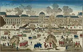 The Swiss filled the windows of the château and stood motionless. The two bodies confronted each other for some time, without either of them making a definitive move. A few of the assailants advanced amicably, and, in what was taken by the revolutionaries to be a gesture of encouragement, some of the Swiss threw some cartridges from the windows as a token of peace. The insurgents penetrated as far as the vestibule, where they were met by a less friendly group of Swiss defenders of the château, commanded by officers of the Court.[25] The two bodies of troops remained facing each other on the staircase for forty-five minutes. A barrier separated them, and there the combat began; it is unknown which side took the initiative. [26] The Swiss, firing from above, cleaned out the vestibule and the courts, rushed down into the square and seized the cannon; the insurgents scattered out of range. The Marseillais, nevertheless, rallied behind the entrances of the houses on the Carrousel, threw cartridges into the courts of the small buildings and set them on fire. Then the Swiss attacked, stepped over the corpses, seized the cannon, recovered possession of the royal entrance, crossed the Place du Carrousel, and even carried off the guns drawn up there.[24][27] As at the Bastille, the cry of "Treachery!" went up. The attackers assumed that they had been drawn into a deliberate ambush and henceforth the Swiss were the subject of violent hatred on the part of sans-culottes.[28][29]