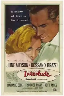 Interlude is a 1957 American CinemaScope drama-romance film directed by Douglas Sirk and starring June Allyson and Rossano Brazzi.[2][3] The film is a reworking of When Tomorrow Comes, a 1939 picture starring Irene Dunne and Charles Boyer. Both films were based on a novel by James M. Cain.[4] Sirk cited Serenade as the title of that book, but in March 2014, in a long article for Senses of Cinema in which he discussed all three works, critic Tom Ryan revealed that both pictures are based on Cain's The Root of His Evil.[4][5]