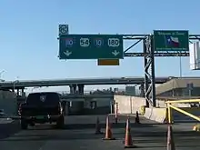 I-110 was a short spur route of I-10 in El Paso that connects I-10 with the Cordova International Bridge at the United States-Mexico border. The highway began at its southern terminus, the beginning of the Bridge of the Americas, which spans the Rio Grande and connects to Mexican Federal Highway 45 (MX 45). The route proceeded north, crossing over all six lanes of Texas State Highway Loop 375 (Loop 375), the Cesar E. Chavez Border Highway, and the divided Delta Drive. Immediately after passing over Delta Drive, the highway's truck lanes split off and pass through a specialized customs area. The roadway's main lanes proceeded northward through the Cordova Point of Entry, where each vehicle is searched by the U.S. Border Patrol. The route continues north, traveling parallel to Chamizal National Memorial, before splitting off and reaching a diverging diamond interchange with U.S. Route 62 (US 62), East Paisano Drive. The road bends eastward, traveling past several houses and businesses, before it reaches an incomplete interchange with US 54, the Patriot Freeway.[2][3] From the interchange, I-110 proceeds north as a complex series of three level entrance and exit ramps, unofficially referred to as the "Spaghetti Bowl".[4] The ramps merge into US 54, and the roadway continues concurrently with it, passing over Lincoln Park before reaching its northern terminus, an interchange with Interstate 10 (I-10). US 54 continues northward from the interchange.[3][5] The Texas Department of Transportation (TxDOT) lists I-110's official length as being 0.891 miles (1.434 km),[1] while the Federal Highway Administration (FHWA) lists it as being 0.92 miles (1.48 km).[6]
