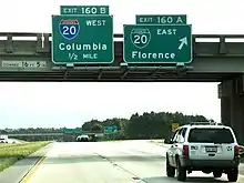 | Florence | Florence | 141.2– 141.5 | 227.2– 227.7 | 141 | Eastern terminus of I-20; signed as exits 141A (north) and 141B (south); I-95 exit 160B | |