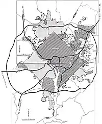 I-70S was projected to continue past the Capital Beltway into Washington, D.C. on the North Central Freeway to connect directly to I-95. Plans for this freeway initially began in 1959 when a freeway was called for along the Georgia Avenue corridor.[31] In the mid-1960s, a study was proposed for the freeway that recommended several different routings between Washington, D.C. and the Capital Beltway.[32] By 1966, a route for the North Central Freeway was planned along a Baltimore & Ohio Railroad line running through the northeastern part of Washington and Takoma Park north to the Capital Beltway.[33] In a 1971 study by DeLeuw, Cather Associates and Harry Wesse & Associates, LTD, I-70S was planned to run from its southern terminus at I-495 and run concurrent with that route before turning south on the North Central Freeway and ending at I-95 in Washington.[30] The routing of the freeway through residential areas of Washington drew opposition from residents of the Takoma Park, Brookland, and Michigan Park neighborhoods who were successful in getting the freeway canceled through their neighborhoods in 1970.[34] The North Central Freeway within Maryland was canceled by the MDSHA in 1972 due to opposition from officials in Montgomery County.[35] In 1975, the Federal Highway Administration officially approved withdrawal of plans to construct the road south of the Capital Beltway.[36] Similar opposition also affected I-70N's eastward extension into Baltimore proper, although a small part of its planned spur, I-170 (now US 40, as the freeway never connected to any other Interstate), was built and opened in 1979. I-70 was eventually truncated to I-695 (the Baltimore Beltway) in 2014.
