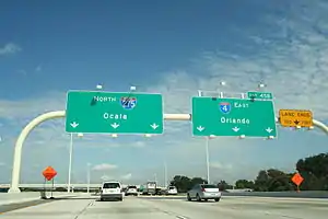 I-275 has an interchange with SR 589, allowing access to Tampa International Airport.[5] At this point, I-275 thins down to three lanes in either direction, and remains this way for the rest of the freeway.[6] 275 then has an interchange with US 92, the first of two interchanges with the road, allowing access to downtown Tampa. 275 then crosses the Hillsborough River for the first time along its route. Afterwards, 6 miles (9.7 km) from its entry into Tampa, I-275 has its next major interchange with Interstate 4, a junction known locally as Malfunction Junction.[2] This junction was always clogged with daily rush hour traffic and was subsequently overhauled.[7] This interchange serves as I-4's western terminus, and allows access to Orlando and the east coast of Florida. After this major exit, 275 reaches an interchange with US 92 again, also allowing access to US 41. After this interchange, US 41 acts as the local road for the freeway for the rest of its route.[8] 275 crosses the Hillsborough River a second time and enters residential neighborhoods within Tampa. 275 travels due north and parallel to US 41 for 4 miles (6.4 km) before turning northeast towards Interstate 75.[2] At this point, 275 exits Tampa and enters Lutz, a suburb of Tampa. I-275 then reconnects with its parent interstate highway (I-75) and reaches its northern terminus.[2][9]