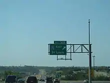 I-470 begins in southern Kansas City at the Grandview Triangle interchange with I-49, I-435, US 50, and US 71. The freeway, concurrent with US 50, travels east through grasslands before meeting the westernmost interchange, a diamond interchange with Blue Ridge Boulevard. A rail line belonging to Kansas City Southern Railway passes under the freeway west of the interchange.[4] The concurrent highways continue east through lightly populated Jackson County past a light residential zone, towards an interchange with Raytown Road. Raytown Road provides access to Longview Lake to the south of I-470. Crossing into urbanized Lee's Summit, the Kansas City Metropolitan Junior College is accessible from the View High Drive interchange. The city line between Kansas City and Lee's Summit is near View High Drive. Exit 7 consists of a cloverleaf interchange with the southern end of Route 350 and US 50, as well as Northwest Blue Parkway and Northwest Pryor Road. Two rail lines surround the cloverleaf interchange, and at one time both were owned by the Union Pacific Railroad, however only the eastern line is operational. The western line once belonged to the Chicago, Rock Island & Pacific, and now is a rail trail after being sold to Jackson County, MO.[4] US 50 leaves the freeway and travels southeast as I-470 curves to the north near the Lee's Summit Municipal Airport.[5]
