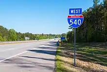 I-540 is the designation for the northern part of the perimeter loop around Raleigh (not to be confused with the I-440 Beltline). Interstate 540 begins at Interstate 40 near the Raleigh-Durham International Airport. Interstate 540 continues northeast until it reaches Aviation Parkway. Interstate 540 has an interchange with Aviation Parkway and continues along the south side of the Brier Creek neighborhood. About a mile after Aviation Parkway I-540 has an interchange with Lumley Road before having another interchange with US 70. After the US 70 interchange the freeway turns a more easterly direction. Interstate 540 has another interchange with Leesville Road, about 3 miles from the US 70 interchange and then continues toward North Raleigh. As Interstate 540 curves around to its northernmost point it starts to parallel Strickland Road, which is further to the south. The road heads north of Wildwood Green Golf Course and then has interchange with NC 50. Further east I-540 has an interchange with Six Forks Road and then Falls of Neuse Road. After Falls of Neuse Road I-540 starts to turn a more southeastern direction. As it approaches US 1 (Capital Boulevard) I-540 crosses a railroad track owned by CSX[5] on an elevated bridge. Interstate 540 has a somewhat combined interchange between US 1 (exit 16) and Triangle Town Boulevard (exit 17). As I-540 continues east it has an interchange with US 401 (Louisburg Road). Interstate 540 continues just south of the Wake Tech campus. I-540 crosses the Neuse River and then turns south towards Knightdale. I-540 immediately has an interchange with Buffaloe Road (exit 20). I-540 continues south paralleling both the Neuse River and Forestville Road. As I-540 enters Knightdale it has an interchange with US 64 Business. About 2 miles (3.2 km) after the US 64 Business interchange Interstate 540 has its western terminus at Interstate 87/US 64/US 264.[6][7]