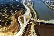 In 1975, I-64 was completed to I-77 which included the US 119 Fort Hill interchange (exit 58A) at milepost 57.48. This segment also involved the construction of the third Kanawha River span, Exits 58B and 58C and the I-77 junction at milepost 58.78. This three-level junction spans local streets and is the largest interchange in West Virginia with piers embedded in buildings, over water and over nearby streets. This also included the viaduct over the Triangle District.[2]