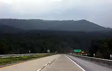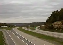 The final segment of Interstate 64 to be completed was between Sam Black Church and the West Virginia Turnpike near Beckley.[2] This revised interstate alignment traverses through an entirely rural area with extremely rugged terrain. Opened in 1988, this final portion is 38 miles (61 km) long and cost approximately $300 million to construct, making it one of the most expensive segments of Interstate Highway in the United States at $7.8 million per mile. It has some extremely rugged terrain, with one segment boasting a 7% grade downhill eastbound for seven miles (11 km) at Sandstone Mountain. Anticipating loss of braking situations, two emergency truck escape ramps were built to be used by runaway trucks. These emergency ramps were used with such frequency that, in addition to large warning signs alerting truckers to the steep grade, a special truck speed advisory system was installed to automatically weigh each truck and indicate the speed at which it should begin the downhill section.