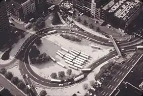 The exit plaza, referred to the "Holland Tunnel Rotary", is in a square superblock that previously housed the New York Central Railroad's St. John's Park Terminal, bounded clockwise from the north by Laight, Varick, Beach, and Hudson Streets. Traffic leaves the tunnel at a portal at the southeast corner of Canal and Hudson Streets, then heads southeast along the south line of Canal Street and south along the west line of Varick Street to the northeast corner of the plaza. From there, five exits, which are numbered sequentially, split from the rotary. One exit goes to each corner of the superblock. A fifth exit, added in 2004, splits to Varick Street on the superblock's eastern side.[12][13] A pedestrian overpass crosses the entrance to the plaza and exit 5 at the northeast corner, since the entrance from the tunnel cuts Laight Street.[11]