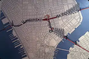 The Lower Manhattan Expressway, also known as LOMEX or the Canal Street Expressway, was a controversial plan for an expressway through Lower Manhattan. The Lower Manhattan Expressway would have begun at the West Side Elevated Highway on the west side of Manhattan, where it would have merged with I-78 at the eastern portal of the Holland Tunnel. From here, the LOMEX would have proceeded generally southeastward as a ten-lane elevated highway, carrying I-78 over what became SoHo and Little Italy. At Centre Street, near the eastern edge of Little Italy, the highway would have split into two branches that both led to bridges over the East River on Manhattan's east side. The main branch would continue southeast as I-78 to the Williamsburg Bridge, while the other would head south to the Manhattan Bridge as I-478. The Manhattan Bridge Spur would have been located above Chrystie Street. The spur to the Williamsburg Bridge would have been mostly depressed or underground, running between Delancey and Broome Streets and passing under the Chrystie Street Connection of the New York City Subway.[31] As part of the project, a third tube to the Holland Tunnel would have been built to provide sufficient capacity for the proposed expressway traffic.[32]