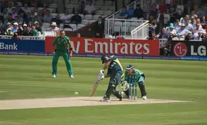 In the run-up to the 2009 ICC World Twenty20, Ireland were deprived of batsman Eoin Morgan, similarly to Ed Joyce several years earlier, who was selected to play for England, making him ineligible to play for Ireland again.[65] Ireland played their first Twenty20 International against a full ICC member side on 8 June 2009 and in their opening match of the tournament defeated Bangladesh by four wickets and knocked them out of the tournament.[66][67] Ireland progressed to the second stage of the competition. They were grouped with New Zealand, Pakistan and Sri Lanka and lost all three of their matches. In 2009, Ireland played nine ODIs, winning the seven they played against Associate nations, losing their only match against a Test team (England), and one match was abandoned.[68]