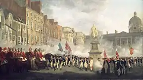 In Dublin on 4 November 1779, the Volunteers took advantage of the annual commemoration of King William III's birthday, marching to his statue in College Green and demonstrating for the cause of free trade between Ireland and Great Britain. Previously, under the Navigation Acts, Irish goods had been subject to tariffs upon entering Britain, whereas British goods could pass freely into Ireland. The Volunteers paraded fully armed with the slogan, "Free Trade or this", referring to their cannon.[3] also cited "Free trade or a Speedy Revolution".[18] According to historian Liz Curtis, the British administration in Ireland was vulnerable, and the Volunteers used this to press for concessions from Britain using their new-found strength.[3] This demand of the Volunteers was quickly granted by the British government.[18] The Dublin Volunteers' review, saluting a statue of King William III,[19] in College Green on 4 November 1779 was painted by Francis Wheatley.