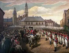 The Volunteers (also known as the Irish Volunteers) were local militias raised by local initiative in Ireland in 1778. Their original purpose was to guard against invasion and to preserve law and order at a time when British soldiers were withdrawn from Ireland to fight abroad during the American Revolutionary War and the government failed to organise its own militia.[1] Taking advantage of Britain's preoccupation with its rebelling American colonies, the Volunteers were able to pressure Westminster into conceding legislative independence to the Dublin parliament.[2][3] Members of the Belfast 1st Volunteer Company laid the foundations for the establishment of the United Irishmen organisation.[4] The majority of Volunteer members however were inclined towards the yeomanry, which fought and helped defeat the United Irishmen in the Irish rebellion of 1798.[1][5]