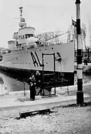 Aquilone was laid down by Odero-Terni-Orlando at their Genoa-Sestri Ponente shipyard on 18 May 1925, launched on 3 August 1927 and completed on 3 December.[1] Upon her completion, Aquilone, together with Turbine, Nembo and Euro was assigned to the 2nd Squadron of the I Destroyer Flotilla based at La Spezia.[5] Between 1929 and 1932 she carried out several training cruises in the Mediterranean.[6] In 1932 during the training exercises she launched and accidentally hit Zeffiro with a torpedo, but fortunately no damage was done as torpedo proved to be defective.[7] In 1931 Aquilone together with Turbine, Ostro and Borea as well as older Daniele Manin, Giovanni Nicotera and Pantera formed 1st Destroyer Flotilla, part of II Naval Division.[8] In 1934 after another reorganization Aquilone as well as Nembo, Euro and Turbine were again reunited, now forming the 8th Destroyer Squadron, part of II Naval Division.[9]