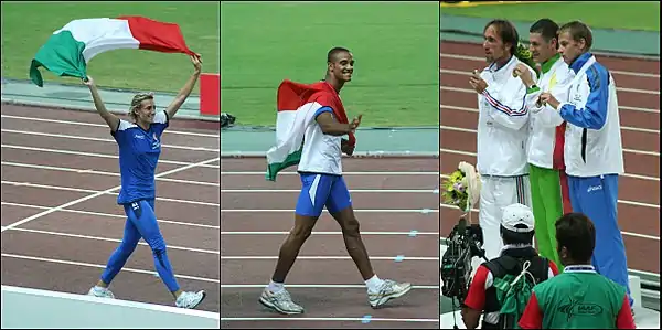 Italian medalists at 2007 World Athletics Championships, Antonietta Di Martino and Andrew Howe with the Italian flag while celebrating and Alex Schwazer on the podium (third from left).