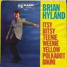 "Itsy Bitsy Teenie Weenie Yellow Polkadot Bikini" is a novelty song telling the story of a shy girl wearing a revealing polka dot bikini at the beach. It was written by Paul Vance and Lee Pockriss and first released in June 1960 by Brian Hyland, with orchestra conducted by John Dixon. The Hyland version reached number one on the Billboard Hot 100, selling a million copies in the US, and was a worldwide hit. The song has been adapted into French as "Itsy bitsy petit bikini" and into German as "Itsy Bitsy Teenie Weenie Honolulu-Strand-Bikini", reaching number one on national charts in both languages. Several versions of the song have proved successful in various European countries. In 1990 a version by British pop band Bombalurina, titled "Itsy Bitsy Teeny Weeny Yellow Polka Dot Bikini", reached number one on the UK Singles Chart and in Ireland.