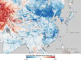 ![]() Variation from average land surface temperatures between 17–24 January 2016 | |